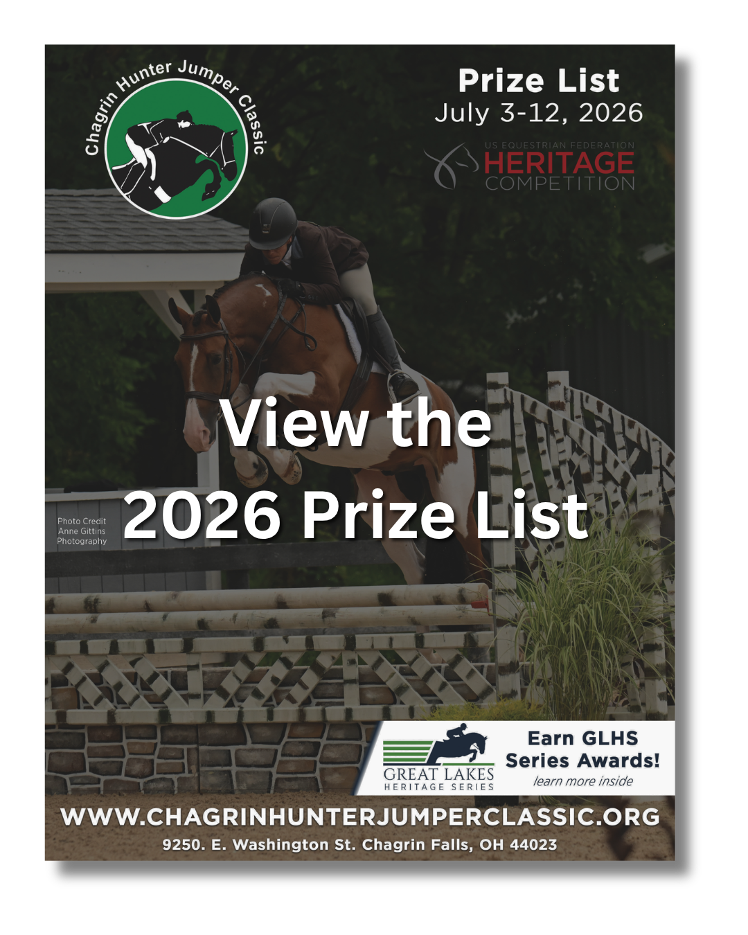 Beautiful Grounds. Affordable Lodging. Premium Footing in Hunter and Jumper Rings. You will be delighted with your experience at the Chagrin Hunter Jumper Classic, here at our new venue with premier footing designed to quickly drain during heavy rains, dry stabling areas, and a fantastic staff to ensure your experience makes it an easy decision to make the CHJC a permanent show on your summer show schedule, year after year!